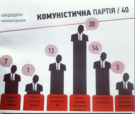 57 порушників зі 155 проаналізованих має "Батьківщина", 44 з 198 – УДАР, 40 з 224 – КПУ, 23 з 106 – "Україна-вперед!", 11 з 33 – " Свобода", серед самовисуванців рух ЧЕСНО знайшов 240 порушників із 607 проаналізованих.