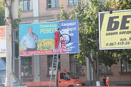 "Щоб захистити улюблену Партію регіонів від свавілля неконтрольованого кандидата, ми наприкінці вересня власним коштом виготовили плакати з символікою Партії регіонів і наклеїли на борди Ревеги".