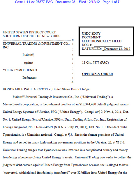 Текст рішення суду, прийнятого за позовом компанії Universal Trading & Investment Co. (UTICo) 12 грудня є в Української правди.