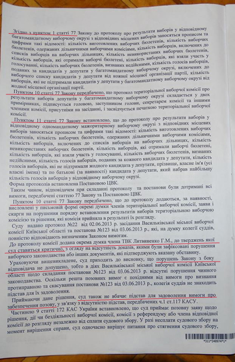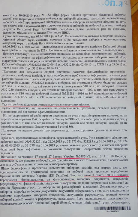 Як зазначив Сергієнко, засідання суду під головуванням судді Брагіної, авершилося винесенням постанови з "дебільними формулюваннями, виписками на статті законодавства про вибори, купою орфографічних помилок та спотворенням прізвища "переможця" на Сабаш С.В. (кандидат, що за підсумками підрахунку голосів переміг – Володимир Сабадаш. – УП)".