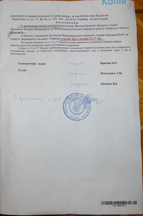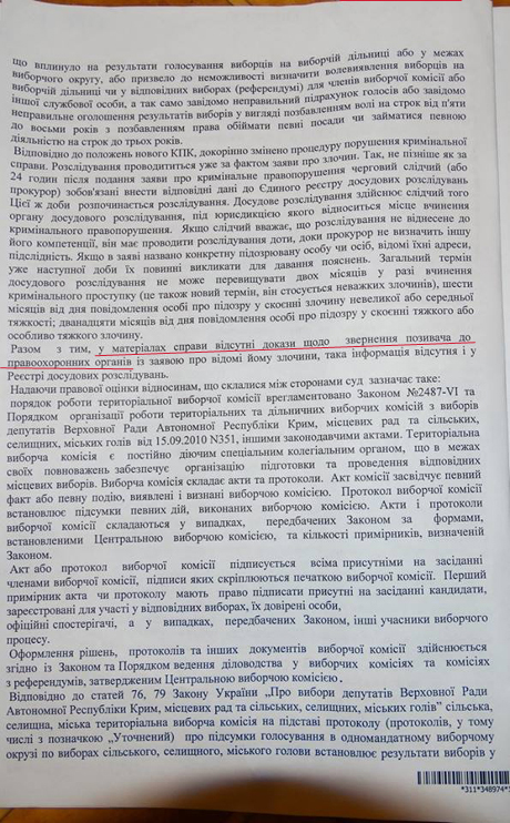 "Київський окружний адмінсуд фактично відмазався від позову з наданням повної картини фальшувань, які відбувалися у місті під час голосування. Відеодокази … були направлені головам опозиційних парламентських фракцій, належним чином були подані через каанцелярію суду, однак про них в постанові взагалі навіть і не згадувалось", - зазначив Сергієнко.
