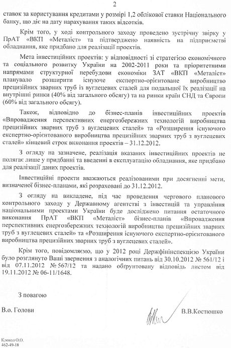 "Враховуючи, що Ваше звернення не містить нових доводів про порушення законності, а згідно з листом Держфінінспекції України від 02.07.2013 №06-11.769 питання остаточного виконання вказаним товариством бізнес-планів буде досліджено під час чергового планового контрольного заходу, підстав для втручання органів прокуратури, в тому числі внесення відомостей, що свідчать про вчинення кримінального правопорушення, до Єдиного реєстру досудових розслідувань, на даний час не вбачається", - написав заступник генпрокурора Білоус.