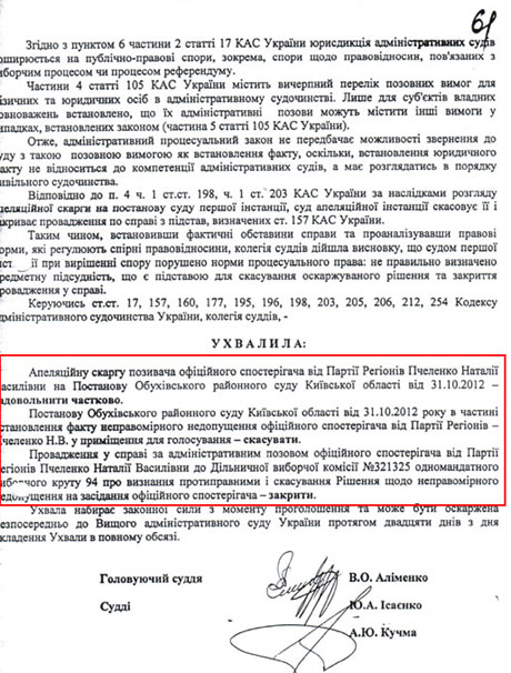 Мова йде про судове рішення, на підставі якого ОВК 94 скасувала голосування по 27 дільницях виборчих дільницях, у тому числі по дільниці №321325 в Обухові. Підставою для цього стало нібито недопущення спостерігача від Партії регіонів на виборчу дільницю №321325.