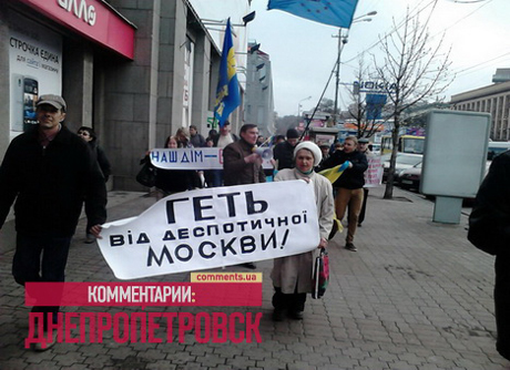 У Дніпропетровську організатори Євромайдана зібрали близько 40 учасників з плакатами "Геть від деспотічної Москви", "Наш дім - Європа" і декількома цитатами Шевченка.