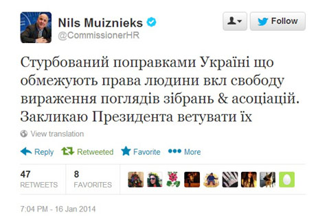 Крім того, комісар з прав людини Ради Європи Нілс Мужніекс закликає президента України Віктора Януковича ветувати закони, які були прийняті Верховною Радою в четвер.