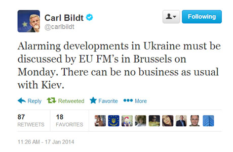 "Тривожні події в Україні мають обговорювати міністри закордонних справ ЄС в Брюсселі в понеділок. Вести справи з Києвом як раніше вже не можна ", - написав Більдт на своїй сторінці в Twitter.