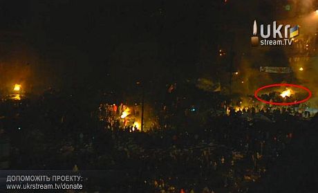 У відповідь активісти закидають силовиків петардами. Зараз потерпілий отримує медичну допомогу від польових медиків. Активісти, що знаходяться на барикадах Грушевського, активісти кажуть, що бійці спецназу відкрили вогонь першими, а це означає, що тимчасове перемир'я закінчено.