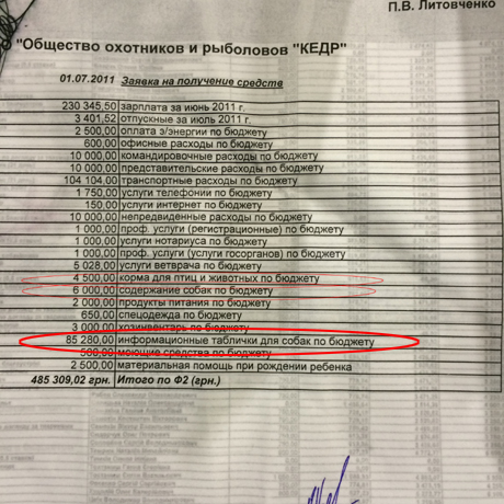 Є видаткові касові ордери. Наприклад виплата 485309,02 гривні, сплачені у 2011 році за бюджетом на липень мисливському і рибальському клубу КЕДР, засновниками якого є "регіонали": Юрій Бойко, Сергій Тулуб іВолодимир Демішкан.