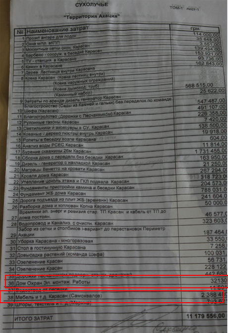 Крім того, є документи про витрати у резиденції президента Сухолуччя. Так наприклад лише на один з об’єктів Схолуччя – "Територія акація" було витрачено понад 11 мільйонів гривень з кам'яними садами за півмільйона і меблями вартістю понад два мільйони. При цьому вартість будівництва будинку для охорони становила трохи більше за 32 тисячі гривень.