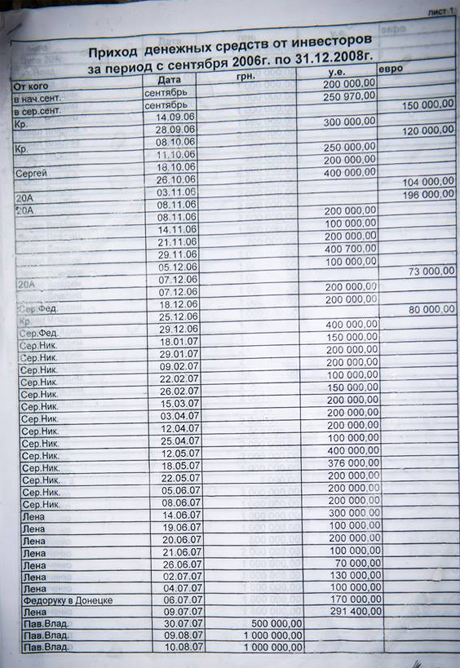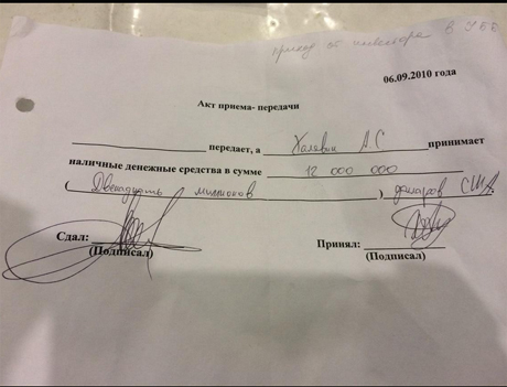 Також там є великий перелік надходжень від "спонсорів", серед яких є папірець, датований 6 вересня 2010 року на отримання 12 мільйонів доларів США невідомим громадянином Халявіним А.С. На папері ручкою дописано "надходження від інвестора в УББ". На інших подібних документах взагалі не вказані прізвища, однак містяться підписи.