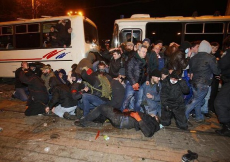 Учасники проросійського мітингу оточили автобус міліції, в якому також були члени самооборони, розбили вікна та розбризкали газ, закинули петарди в автобус.