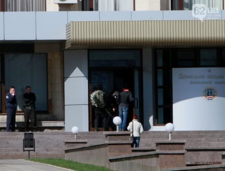 | У Донецьку міськраду спершу увійшли 7 осіб у масках, з автоматами й гвинтівками. Фото з 062.ua |