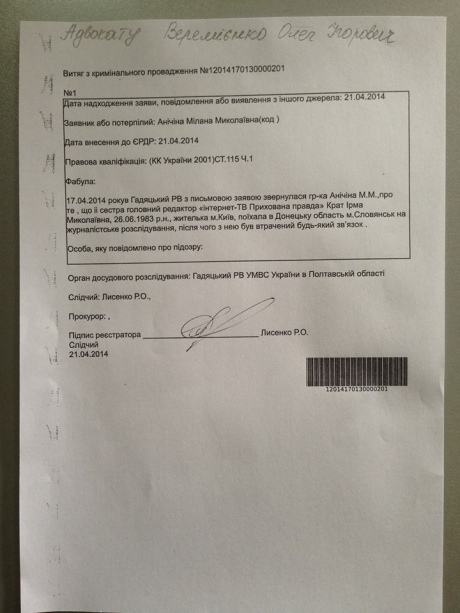 "20 і 21 квітня в ЗМІ з'явилася інформація про те, що в Слов'янську прихильники так званої Донецької народної республіки викрали п'ятьох журналістів: українських репортерів Ірму Крат та Сергія Лефтера, італійських - Поля Гого і Коссімо Аттанасіо, а також їх білоруського колегу Дмитра Галко. Різні джерела повідомляють, що у викрадених відібрали гроші, документи, фототехніку і силою утримують їх у полоні", - зазначили в МВС.