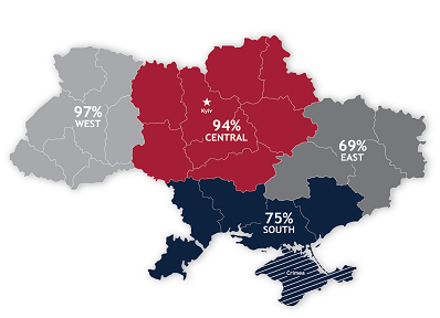 | Захід - 97%, Центр - 94%, Південь - 75%, Схід - 69% |