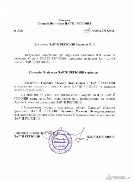 Керівництво Партії регіонів відсторонило екс-губернатора Одеської області Миколи Скорика з посади голови облорганізації політсили і виключило його з партії.