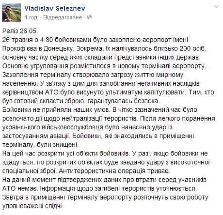 Він констатував, що донецький аеропорт знаходиться під контролем українських силовиків.