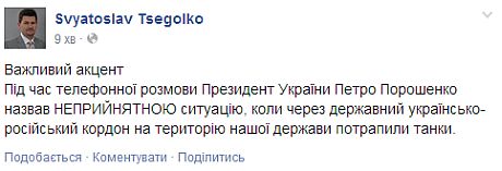 Також прес-секретар президента України Святослав Цеголко зазначив, що в розмові Порошенко назвав неприйнятною ситуацію, "коли через державний українсько-російський кордон на територію нашої держави потрапили танки".