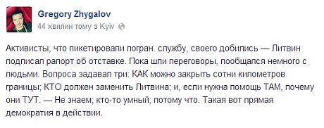"Активісти, які пікетували прикордонслужбу, свого досягли — Литвин підписав рапорт про відставку", - написав він на своїй Facebook-сторінці.