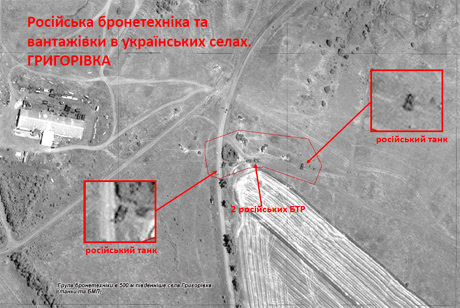 | Російська бронетехніка та вантажівки в українських селах. Григорівка |