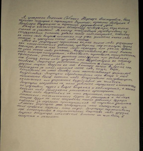 Вона заявила, що не вважає цю експертизу незаконною. Вона відмовляється спілкуватися з працівниками клініки і давати свідчення, заповнювати будь-які анкети і проходити будь-які тести, вживати препарати та ін.