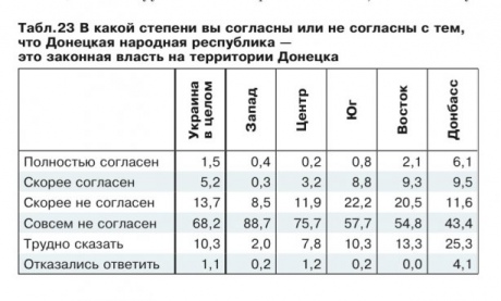 9,4% жителів Донецька й області вважають "ДНР" законною, а 13,9% людей там скоріше згодні з такою постановкою питання. Таким чином, 23,3% громадян підтримують "ДНР" на території Донецької області.