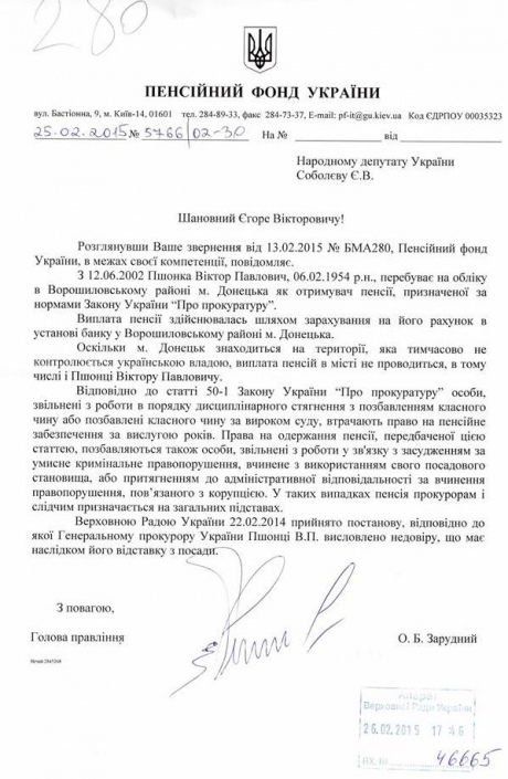 "Як стверджує Пенсійний фонд, (Пшонка пенсію) не отримує. Але держава Україна нараховує пенсію пенсіонеру Пшонці як жителю окупованого міста Донецьк", - написав він на Facebook.