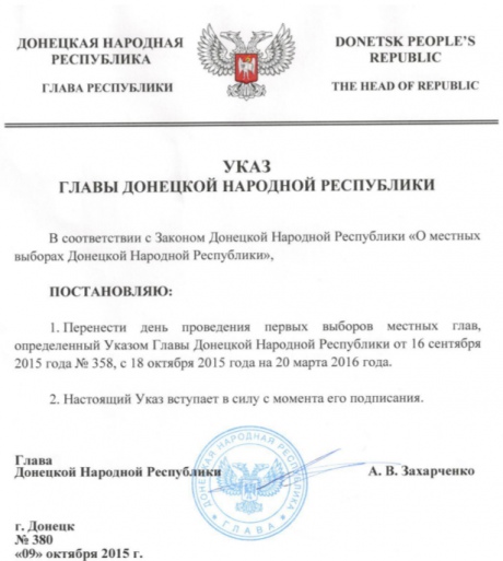Ватажкок ОРДО Олександр Захарченко призначив місцеві псевдовибори на 20 березня 2016 року. Текст його указу наводить ДАН, підконтрольне бойовикам.