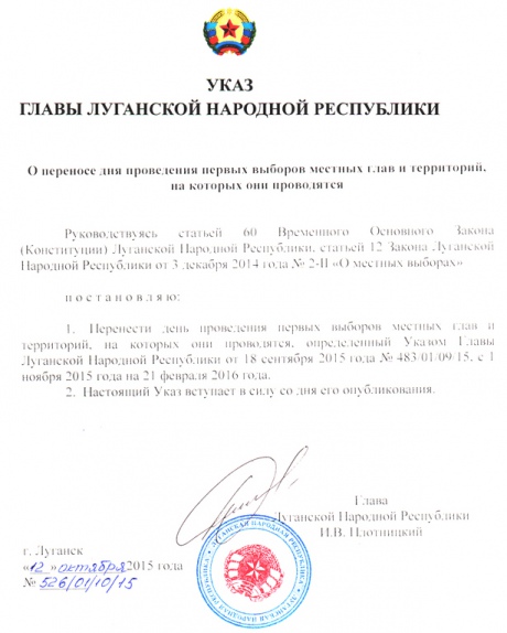 Так, сайт Луганськінформцентр оприлюднив указ ватажка ОРЛО Ігоря Плотницького про призначення псевдо виборів на 21 лютого 2016 року, .