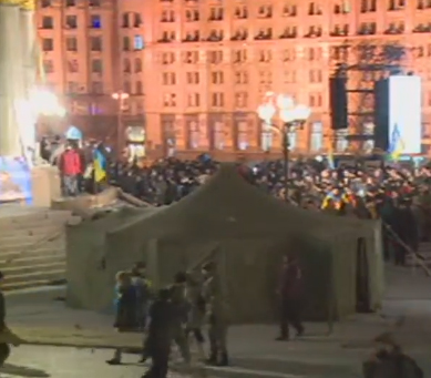 Разом з тим невідомі, які раніше зайняли актову залу готеля "Козацький", встановили біля стели намет, у якому, за даними ЗМІ, готуються провести ніч і готуватися до Віча, яке має початися 21 лютого о 17:00. За повідомленням, поліція не перешкоджала невідомим ставити намет, ті у свою чергу запевнили що не мають зброї і не планують ніяких провокацій.
