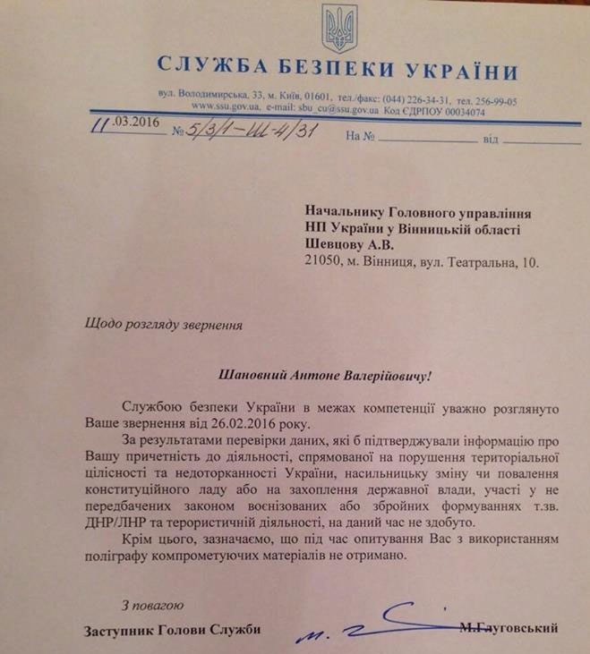 "Крім цього зазначаємо, що під час опитування Вас з використанням поліграфу компрометуючих матеріалів не отримано", - додали в СБУ.