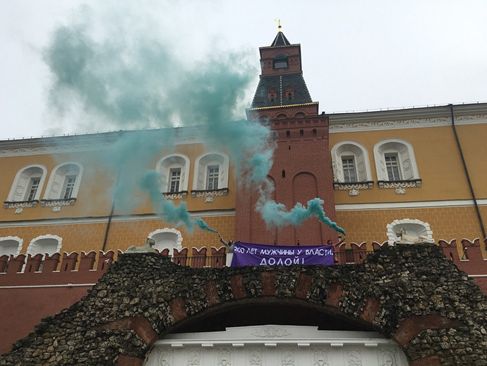На Червоній площі в Москві затримано семеро осіб через розгорнуті активістками плакати з написами "Жінку - в президенти", "Жінку - в патріархи", "Вся влада - жінкам", "200 років чоловіки при владі. Геть!".