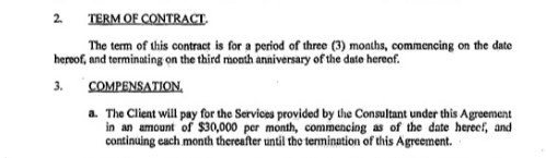 Підписант контракту сплачуватиме за отримані послуги $30 тис. на місяць до моменту припинення дії угоди, термін дії якої становить 3 місяці,