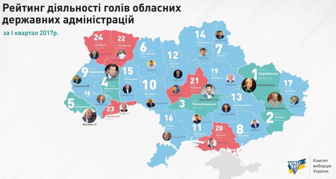 Комітет виборців України склав "Рейтинг діяльності голів ОДА за І квартал 2017 року".