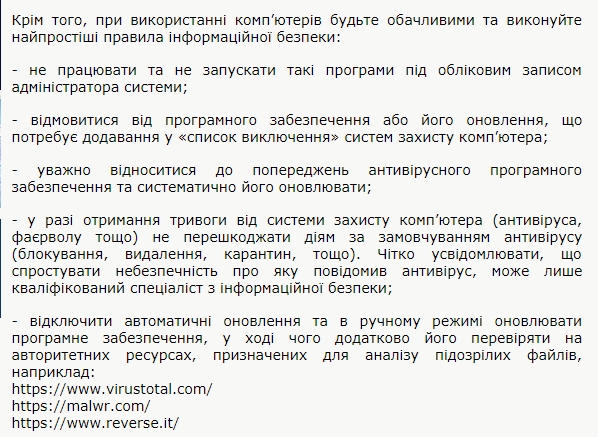 "У разі виконання цих рекомендацій користувач несвідомо заборонить системам захисту комп’ютера правильно та вчасно реагувати на шкідливу діяльність програмного забезпечення, доданого у "список виключення". Слідуючи таким рекомендаціям користувач відкриває зловмисникам доступ до свого комп’ютера через вказане програмне забезпечення в обхід системи захисту, піддаючи небезпеці не лише власний комп’ютера, а і всю локальну мережу", - заявляють у кіберполіції.