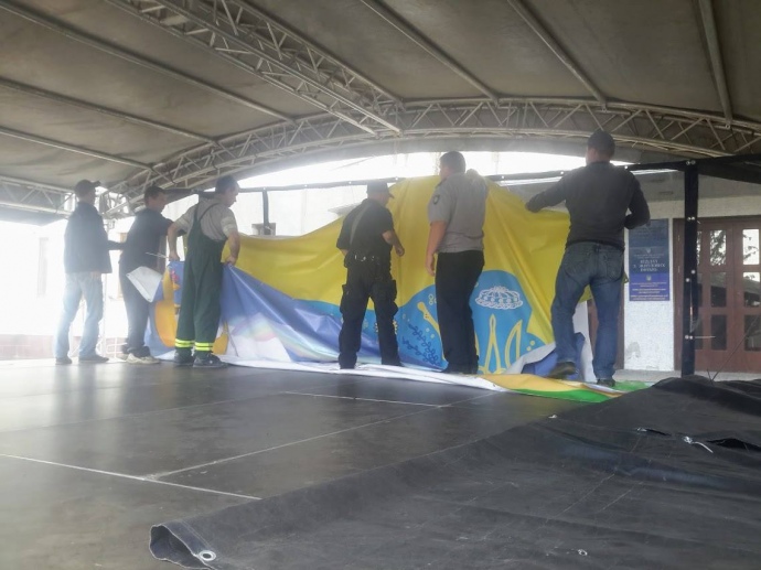 Після того,як карту без Криму та Донбасу демонтували, на сцені зявився інший банер - з веселкою, всміхненим сонцем та дітлахами. Очевидці кажуть, що правоохоронці просто стояли осторонь і спотерігали за зміною "картинок".