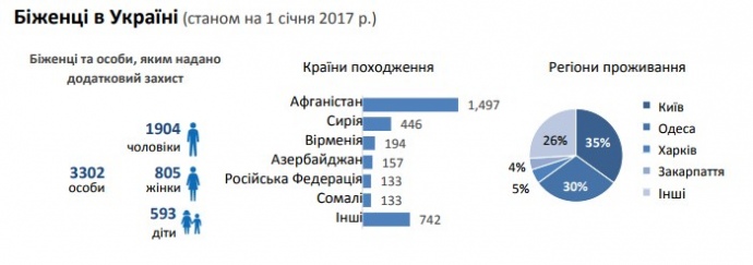 Станом на січень 2017 року 3 302 іноземців мають статус біженця в Україні.