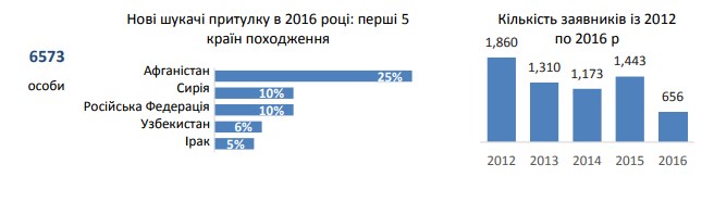 "Попри великий приплив біженців і мігрантів середземноморським і балканським маршрутами, нині немає свідчень істотного збільшення кількості новоприбулих в Україні. Більше того, після чотирьох років зі стабільною кількістю новоприбулих у 2016 році кількість нових шукачів притулку зменшилася більш ніж на половину, тобто з 1433 нових заявників у 2015 р. до 656 у 2016 р", - йдеться у звіті.