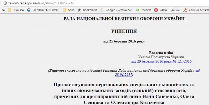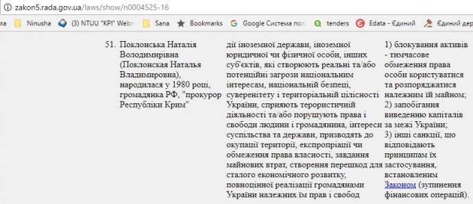 Поклонська також послалася на документ за підписом президента України Петра Порошенка від 26 березня 2016 року про персональні санкції проти тих, хто мав відношення до справи Савченко, Кольченко і Сенцова, де колишня прокурор Криму вказана як громадянка Росії.