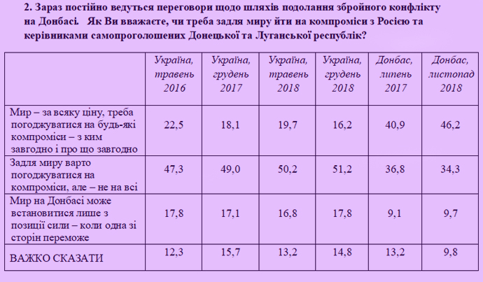 При цьому на будь-які компроміси згодні лише 16%, а 51,2% вважають, що "задля миру варто погоджуватися на компроміси, але не на всі".