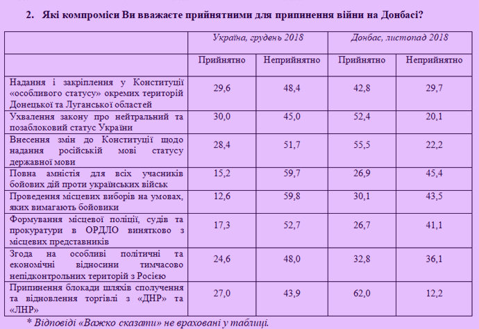 Для жителів Донбасу, а також Південного та Східного регіонів України більш прийнятними є надання ОРДЛО "особливого статусу", надання російській мові статусу державної, ухвалення закону про нейтральний та позаблоковий статус України та відновлення шляхів сполучення і торгівлі з окупованими територіями.