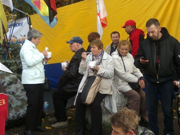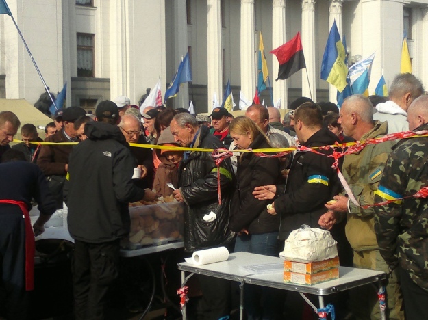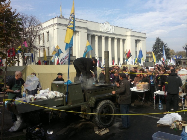 У наметовому містечку біля ВР розпочався обід. З польової кухні усім охочим роздають кашу та чай. Уже утворилося 2 черги.