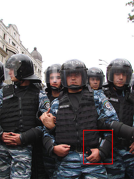 На изображении отчетливо видно, что сотрудник "Беркута" укомплектован баллончиком слезоточивого газа "Кобра".
