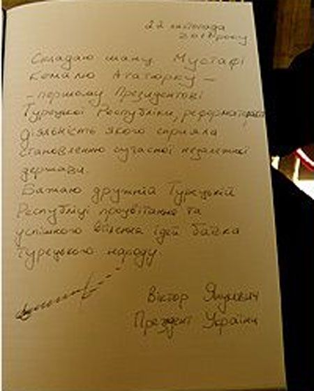 Запись в книге почетных гостей в мавзолее Кемаля Ататюрка в Анкаре вместо Виктора Януковича сделала его пресс-служба.