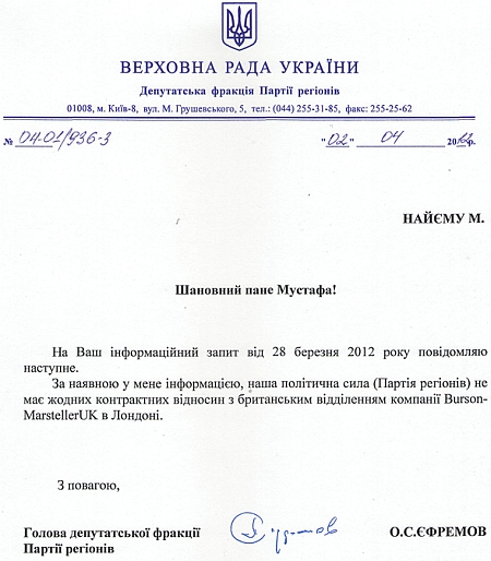 Как известно, на аналогичный запрос в лондонском офисе PR-агентства подтвердили, что Burson-Marsteller действительно сотрудничает с Партией регионов.