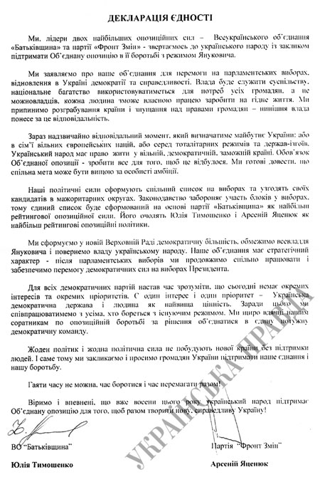 "Декларацию единства", подписанную Тимошенко и Яценюком, зачитал на пресс-конференции в понедельник заместитель главы "Батькивщины" Александр Турчинов.