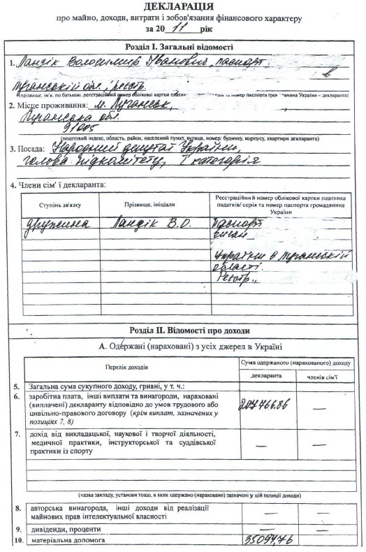 Члены семьи Ландика получили 360 тысяч гривен дохода от предпринимательской деятельности, 134,79 тысяч гривен дохода от передачи в аренду имущества и 9,7 тысяч гривен пенсии.