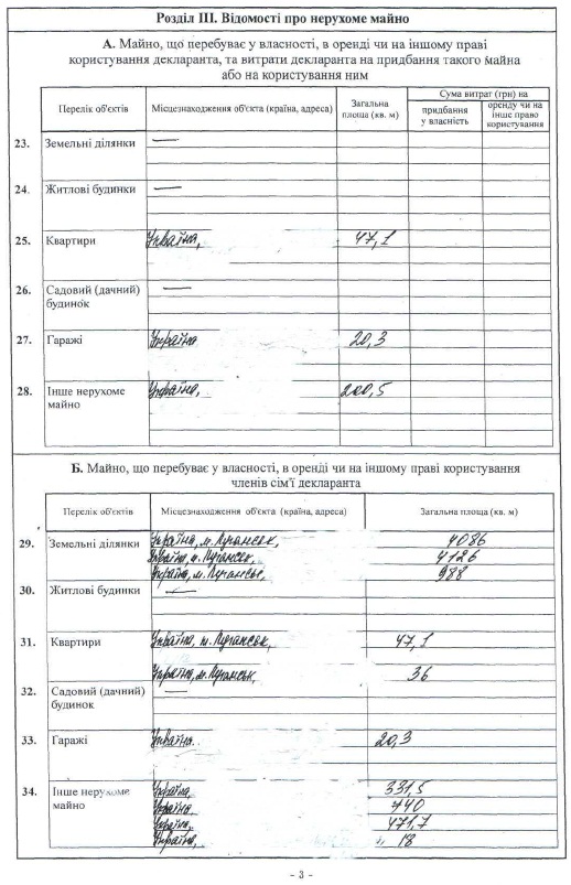 В собственности депутата находятся квартира площадью 47,1 кв.м., гаражи (20,3 кв.м.) и недвижимое имущество (200,5 кв. м.). В декларации указано, что все имущество находится в Украине.