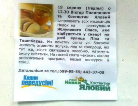 По словам автора письма, 19 августа 2012 года на православный праздник Спаса на Нивках, Пилипишин устроил концерт на который собрал тех, кому за 60, не считая молодых мам которые играли в сквере с детьми.
