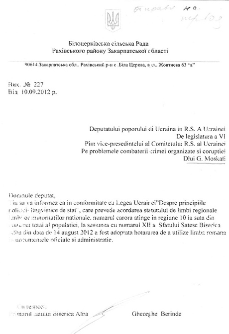 "Согласно положениям Закона об основах государственной языковой политики, который предусматривает предоставление статуса регионального языка языкам национальных меньшинств, количество которых в регионе составляет 10 процентов от общего количества населения, на ХІІ сессии сельсовета Белой Церкви от 14 августа 2012г. были приняты решения применять румынский язык в официальных и административных документах", - сообщил глава сельсовета Георге Беринде.