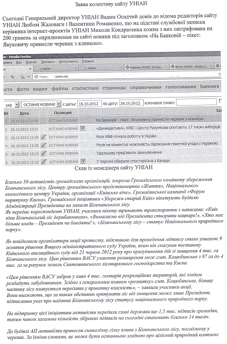 "Гендиректор УНИАН Вадим Осадчий довел до редакторов сайта УНИАН Любви Жаловагы и Валентины Романенко, что на основании служебной записки руководителя интернет-проектов УНИАН Николая Кондратенко каждая из них оштрафована на 200 гривен за публикации на сайте новости "На Банковой - пикет: Януковичу принесли ботинок с елкой", - сообщают журналисты.